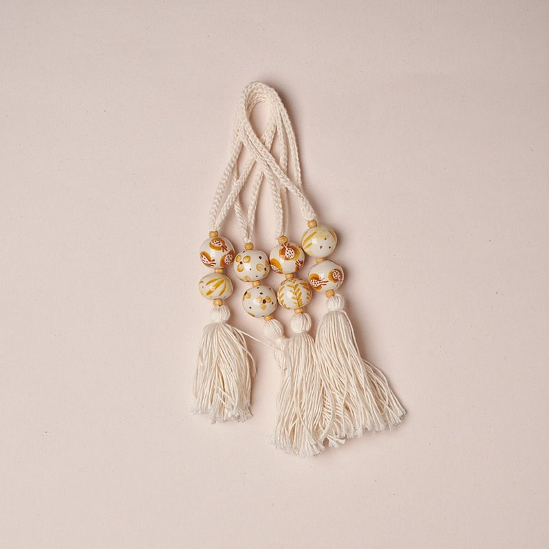 Set de 4 borlas dobles en cerámica orgánica e hilo de algodón. Creado y pintado por manos artesanas inspiradas en el árbol del magnolio, cada pieza evoca la naturaleza misma: imperfecta, vital y sagrada. Al sostenerlo, lo que llega a la mesa no es solo un objeto, sino un fragmento de humanidad, un acto de amor por la vida compartida y por el patrimonio inmaterial que seguimos tejiendo con las manos.