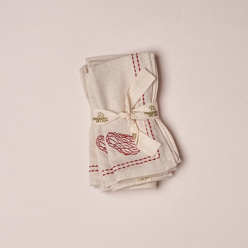 Set de 4 servilletas elaboradas en fibras de lino y algodón. Bordadas en hilo 100 % algodón con diseños inspirados en el árbol del magnolio.